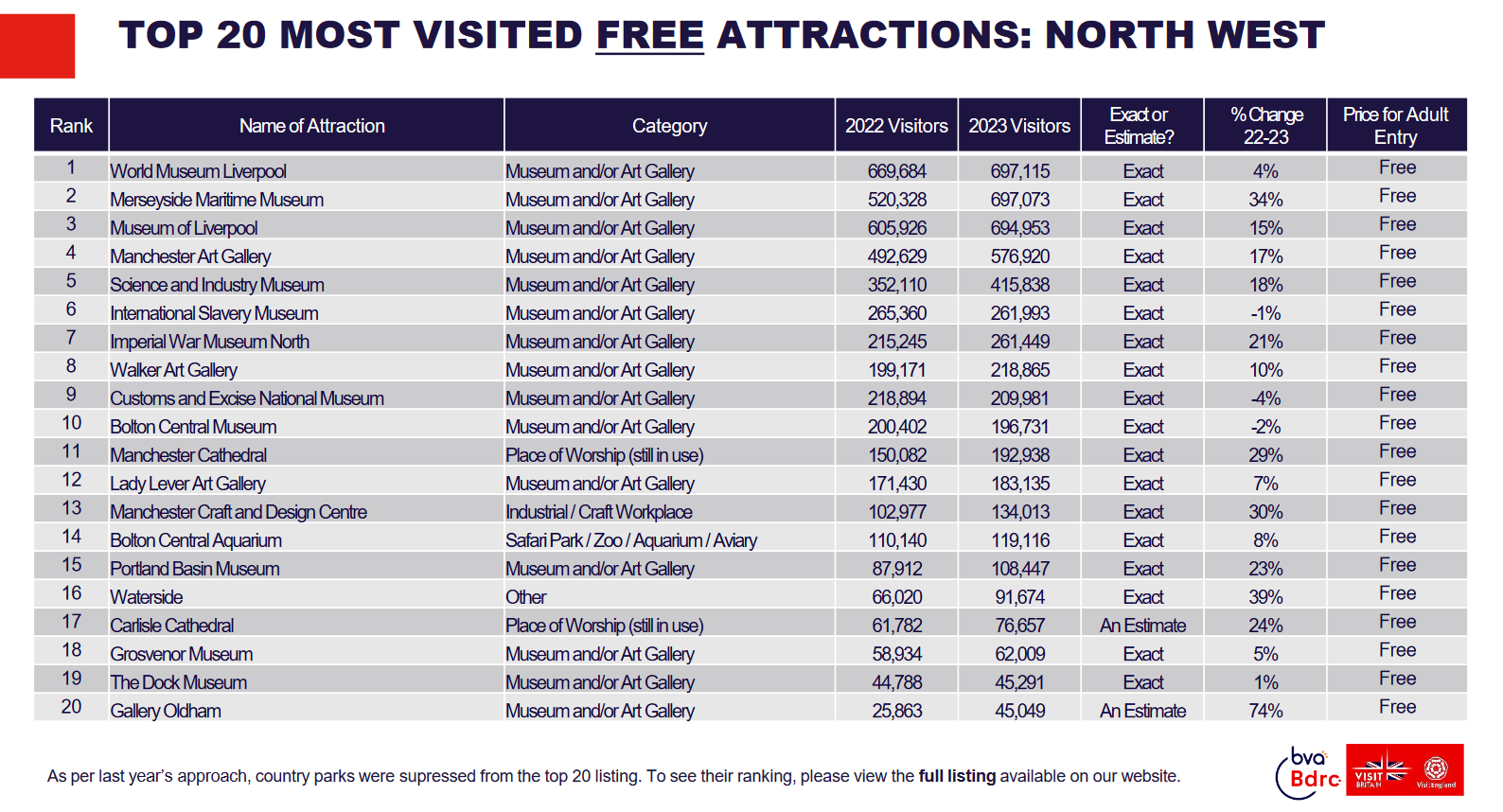 Overall, visits to attractions in England continued to increase and were up 11% in 2023 compared to 2022 with the rate of growth slower than in the previous 2 years and with numbers down 28% on 2019 (see slide 7 of full trends report). VisitEngland Director Andrew Stokes said:- "It's good to see continued growth in visits to our wonderful attractions and this survey underlines what we know from the industry, that there remains ground to be covered to get our sector back to pre-pandemic levels and that the cost of living crisis continues to bite. Our exceptional attractions remain vitally important to our tourism offer and it's no surprise international and domestic tourists are returning to our 1st class museums and galleries and our world-beating castles and historic houses. With the summer holidays fast approaching I urge everyone to show your support, boost local economies through tourism and make magical memories in England's high quality and varied attractions." Chief Executive of Historic England Duncan Wilson said:- "These statistics give us a window into the challenges that many of England's attractions are still facing, but it's encouraging to see that numbers of visits are slowly climbing. We know that visiting heritage attractions can do so much for our mental health and wellbeing, so we want to see visitor numbers continue to grow. Everyone deserves to access, and learn from, the places and spaces which helped to shape who we are." The survey, which gathered information from 1,513 English attractions, shows that growth was fuelled by the return of overseas visitors and an increase in school trips in 2023. International visits to England's attractions were up 80% last year compared to 2022. Domestic visits to attractions in 2023 meanwhile saw a decrease of 2% on the previous year. Most Regions saw admissions grow between 4-8% with London the exception seeing growth of 26% largely driven by international visitors. Despite the high percentage increase the volume of attraction visits in London remains well below 2019 levels, at -22%. Liverpool took the top 3 Most Visited Free Attraction slots for the North West of England with:- The World Museum Liverpool in 1st place, 2nd place was the Merseyside Maritime Museum Museum and 3rd place was the Museum of Liverpool. The Tower of London was again in the top spot last year as the most visited:- 'paid for' attraction in England, with 2.8 million visitors, up 38% on 2022, although down 6% on 2019. Kew Gardens also retained 2nd place with 2.0 million visitors, up 1% on 2022 and Chester Zoo came in 3rd with 1.9 million, up 6% on 2022. The British Museum also regained poll position in the list of:- 'free attractions' in England in 2023, with 5.8 million visitors, up 42% on 2022 although still down 7% on 2019. 2nd was the Natural History Museum with 5.7 million visitors, up 18% on 2022. The 3rd most visited free attraction in England in 2023 was the Tate Modern with 4.7 million visitors, up 22% on 2022. The highest levels of growth were seen in the 'Museum/Art Galleries' category, which suffered one of the sharpest declines in visitors because of COVID19, with a 20% increase in visits in 2023 compared to 2022. 'Places of Worship' saw the 2nd largest increase, up 19% on the previous year, and 'Visitor/Heritage Centres' showed recovery in visitor numbers last year, up 14% on 2022. 'Historic Houses/Castles' also saw good growth with a 13% increase in 2023 on the previous year. To see the results of the VisitEngland Annual Survey of Visits to Visitor Attractions in 2023 including regional data see VisitBritain.Org Tourism is 1 of England's largest, most valuable industries, supporting 200,000+ businesses, employing about 2.6 million people and, in 2023, generating £70.2 billion in domestic visitor spending. COMMENTS (0)