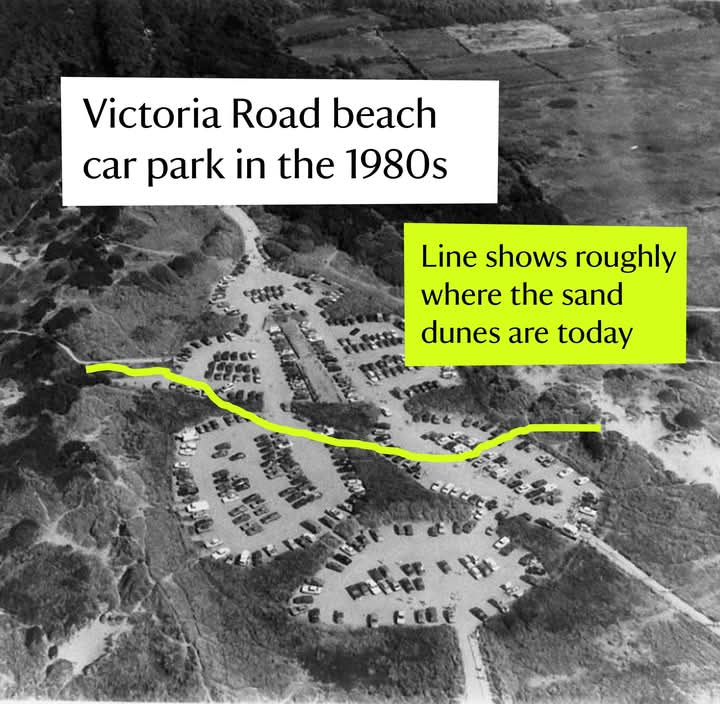 The image below shows the Victoria Road beach car park back in the 1980s and the rough location of where the sand dunes are today; that is around 1/3 of the parking spaces have been reclaimed by natural dune rollback.
