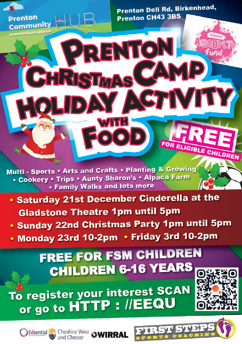 The free club is suitable for children between the ages of:- 6 and 16, and ran by First Steps Sports Coaching; an experienced team who are inclusive and SEND friendly. The fun days include:- going to the theatre, a Christmas party, arts and crafts, sports and a nature trail experience; with food and drink provided. ![]() On Saturday, 21 December 2024, from 1pm, there’s a visit to the Cinderella Christmas Panto, at:- The Gladstone Theatre; with transport, food and drink provided by the team. On Sunday, 22 December 2023, there's a big Christmas party, from:- 1pm, at:- Prenton Rugby Club; featuring food, drink and lots of stimulating games, sports and more. On both Monday, 23 December 2024, and Friday, 3 January 2025, there’s a fun day taking place at the club; featuring a range of activities including:- sports, arts and crafts, games, a nature trail experience, planting and growing, cookery, Nanny Sharon’s Alpaca Farm and more. A perfect opportunity to keep the kids busy and entertained during the Christmas holidays, it gives parents a well deserved break too. ![]() First Steps Sports Coaching’s Craig Elkerton said:- "We pride ourselves on providing an inclusive environment offering traditional and non-traditional sports, speed, agility, quickness drills, games, non-competitive fundamental movement games, dodgeball, rounders, quick cricket, touch rugby, football, relay races and other activities. We deliver fun sessions enabling children to develop new skills. We provide children with lots of opportunities to explore nature, with history walk and talk sessions, arts, and crafts, den building, intergenerational activities storytelling, along with planting and growing vegetables and enrichment external trips to places like Nanny Sharon’s Alpaca Farm. The feedback is always amazing for our clubs and we’re looking forward to another great few days this Christmas." ![]() A free Christmas Holiday Camp for children is taking place at Prenton Rugby Club! On Saturday, 21 December, Sunday, 22 December, Monday, 23 December 2024, and Friday, 3 January 2025, there will be a range of fun and engaging activities; free for children who qualify for benefits related free School Meals. Prenton Christmas Holiday Camp will take place at:- Prenton Rugby Club, Prenton Dell Road, Prenton, Merseyside, CH433BS. ![]() Each HAF child needs a ticket to attend a session. To apply please go to:- EEQU.Org. ![]() COMMENTS (0)
