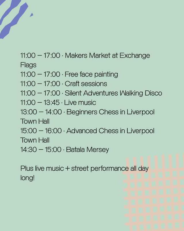 Street Performers including:- Flower Pot People and Stilt walkers in:- 30 and 40 minute slots throughout the day at:- 11.15 am, 1 pm, 1.45 pm, 3 pm and 3.30 pm Batala Mersey will perform at:- 2.30 pm to 3 pm, performing across the street, finishing at:- Exchange Flags. There will be four busking spots featuring live music performances all day. These will be at:- Ezra & Gill by Derby Square, Exchange Flags, Castle Street Townhouse, and the Town Hall balcony. Music will finish with a Sticky Lips roaming brass band hour long performance at:- 4 pm. There will be offers at key locations along:- Castle Street, including:- Fresh lemonade at Pho, Ice Cream Giveaway with:- San Carlo, 2-4-1, Liverpool Gin Distillery, 2 for £10 drinks at Black Barrel, 3 for £20 on small plates at Zeus, Happy Hour at Fazenda and free sangria within a meal at So Salsa. At the Town Hall, from:- 12.45 pm to 3:45 pm, there will be Beginners Chess and Advanced Chess sessions. This is part of the British Chess Championships taking place in Liverpool, from:- 31 July to 10 August 2025. Booking is required for these sessions. Please use the link below to book for the free class. ![]() Explore the full programme here.